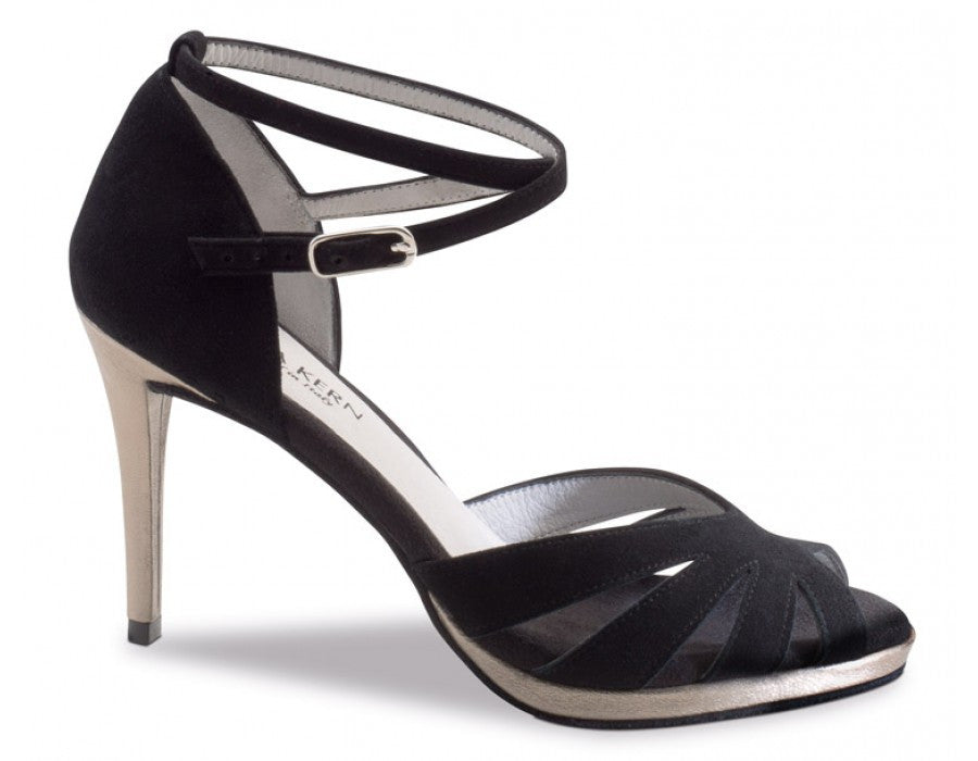 The alliance of black suede and a heel and a platform covered in chevro antique leather makes this Anna Kern dancing shoe unique. The elegant front, with the individually adjustable ankle strap, provides a perfect and safe fit.