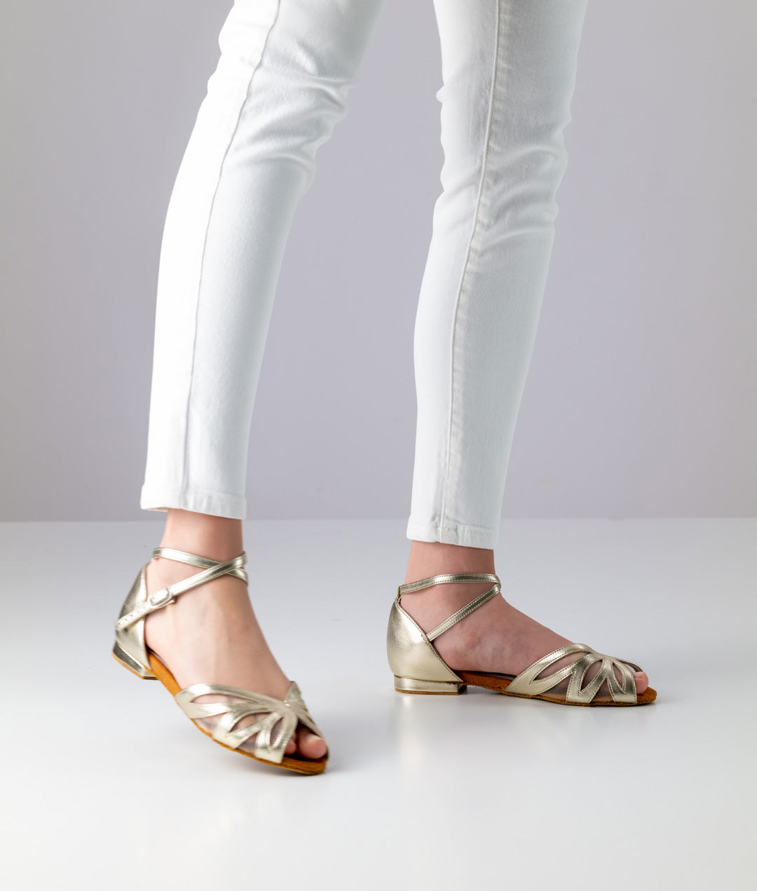 Get glitz and glamour to the dance floor with the elegant flat dance shoe sandal Margo from Anna Kern. This enchanting sandal made of golden nappa leather and airy mesh inserts offers a breathtaking look and maximum comfort. The sophisticated design with delicate straps caresses your foot and ensures a secure hold.