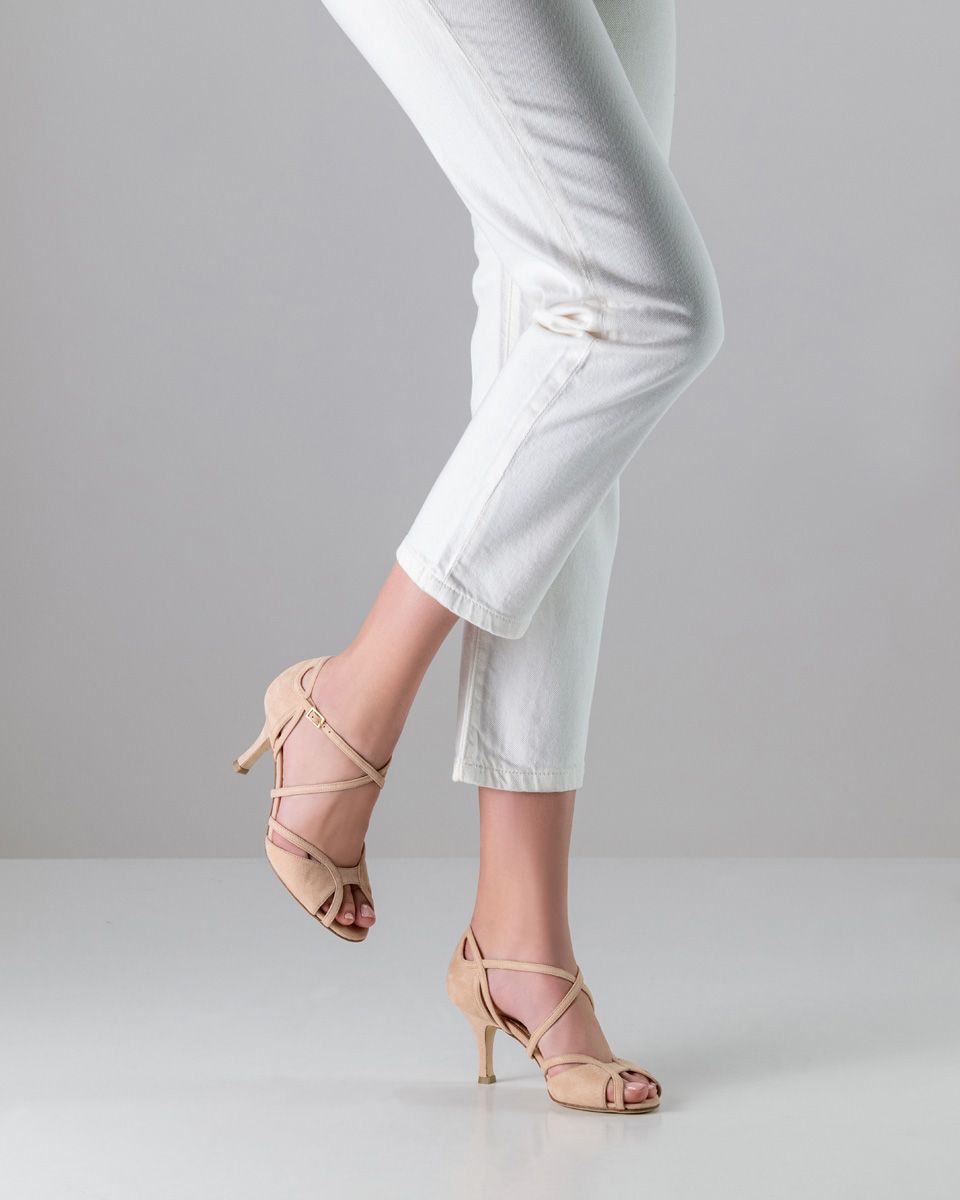 Elegant Nueva Epoca dance shoe by Werner Kern. Elaborately crafted cut-outs on the heel and the exclusive velor print combine with the cross instep straps to create a harmonious and exclusive overall picture. The straps are of course individually adjustable both under the sole and on the heel and thus provide a secure and comfortable hold.
