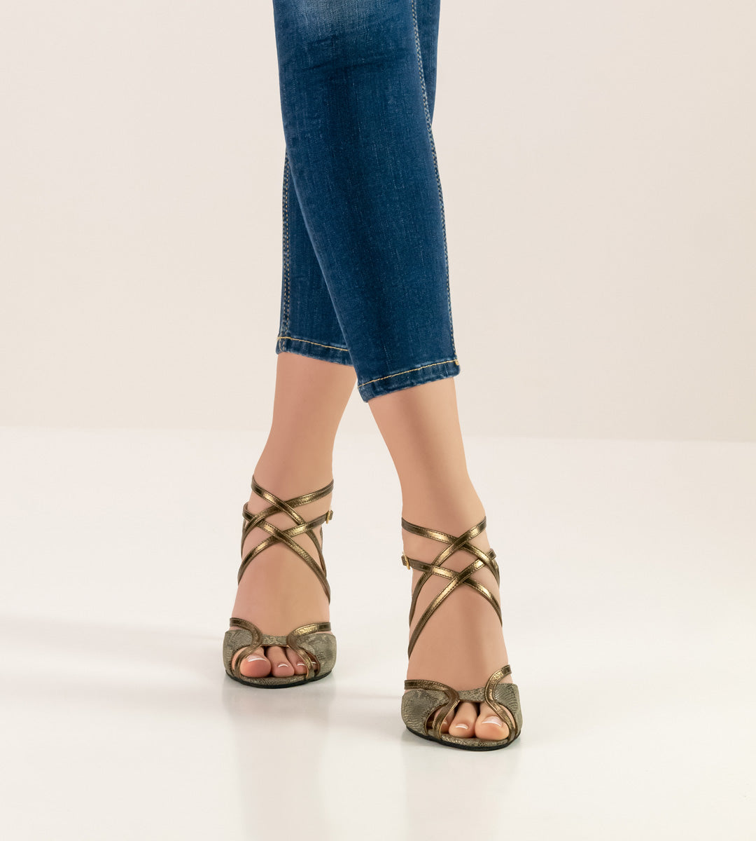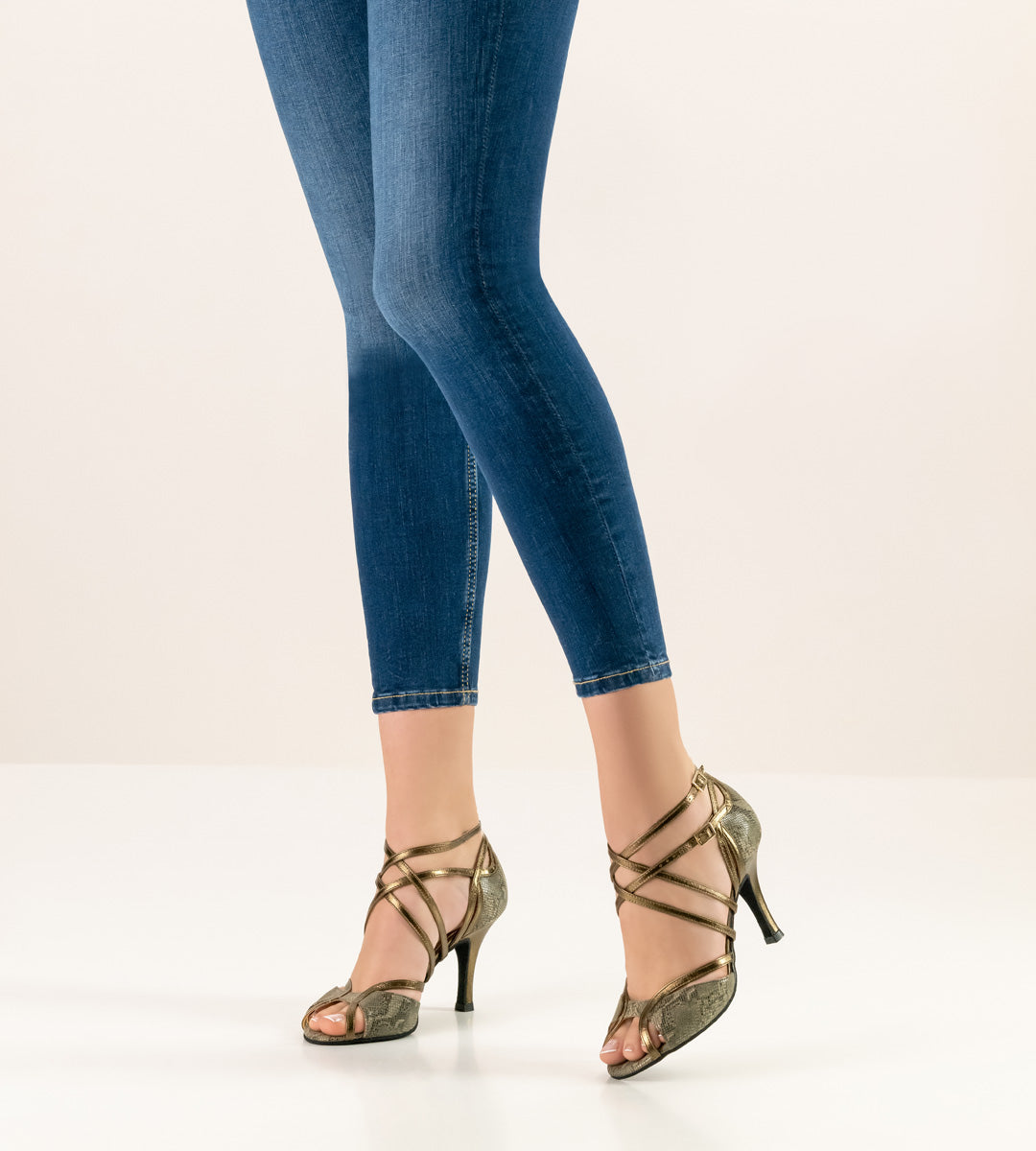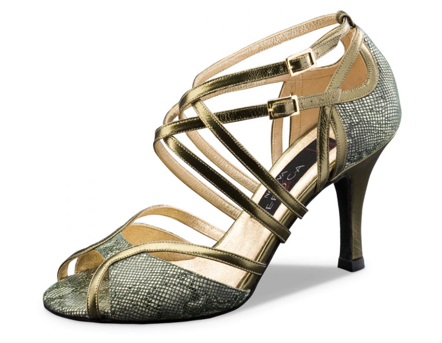 Elegant Nueva Epoca dancing shoe by Werner Kern. Extensively crafted cut-outs at the heel and the exclusive snake print combined with the crossed instep and heel straps give the shoe its harmonious and exclusive overall look. The straps can be individually adjusted beneath the sole as well as at the heel, providing a secure and comfortable fit.