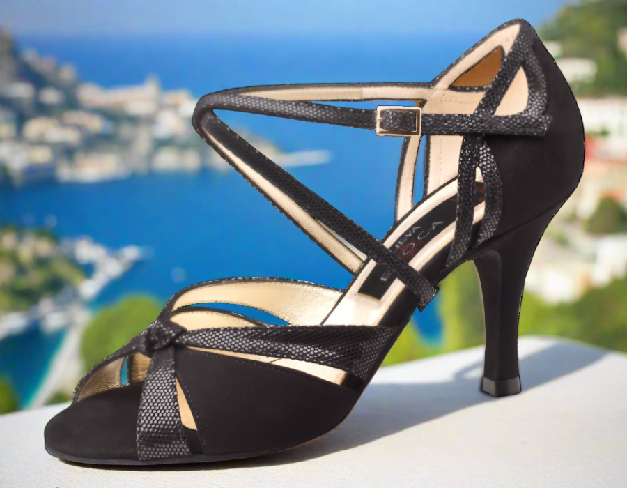 Attractive Nueva Epoca dancing shoe by Werner Kern. The bow-shaped lines are a special eyecatcher in the front part of the shoe. The individually adjustable ankle straps provide a stable, comfortable and unique fit.