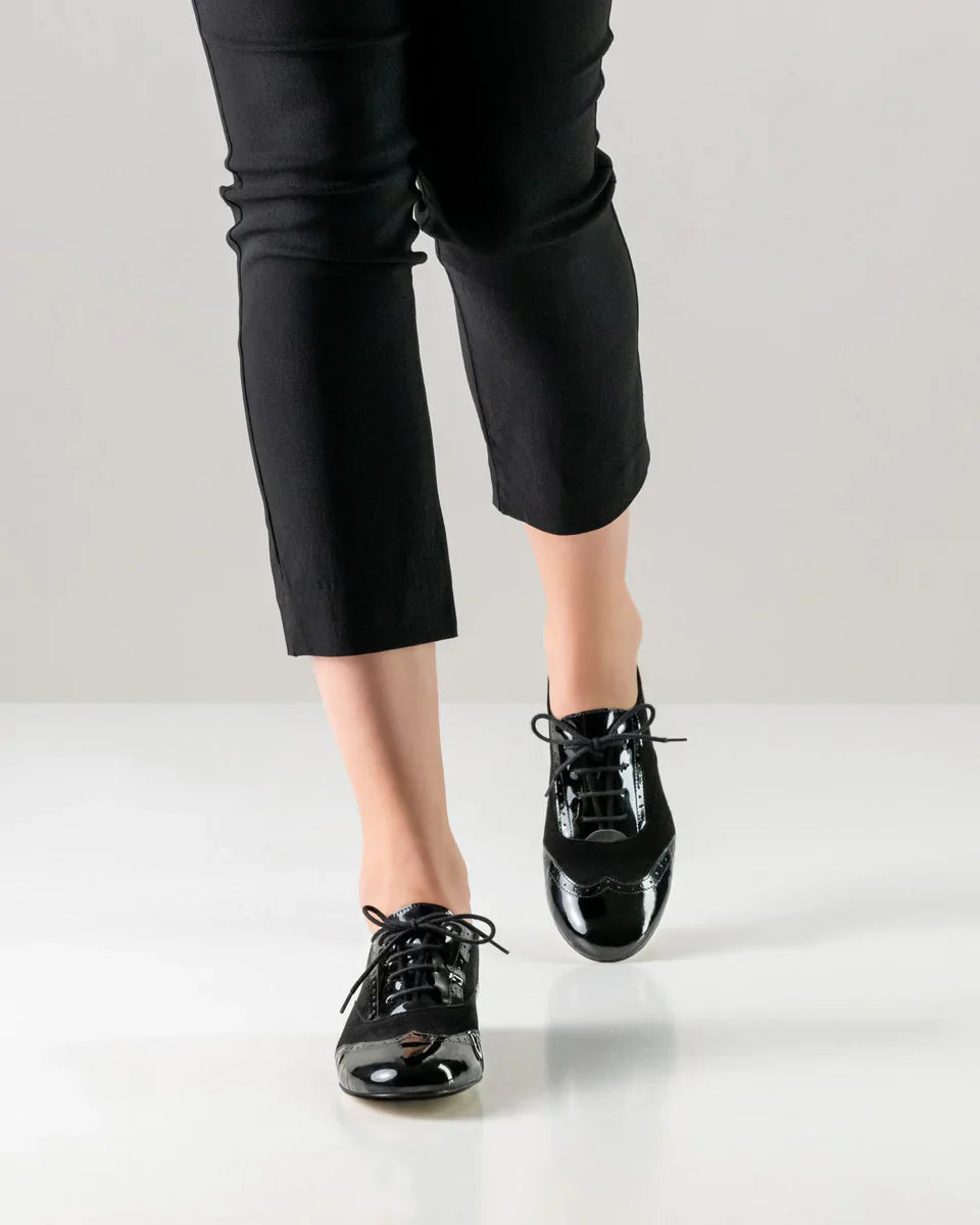 Your dancing companion for the whole evening. Super comfortable ladies' oxford dance shoe made of soft suede and patent leather. The shoe has a comfortable width and offers perfect and secure hold due to the 4-hole lacing. Due to its special processing, the item is extremely flexible and comfortable.