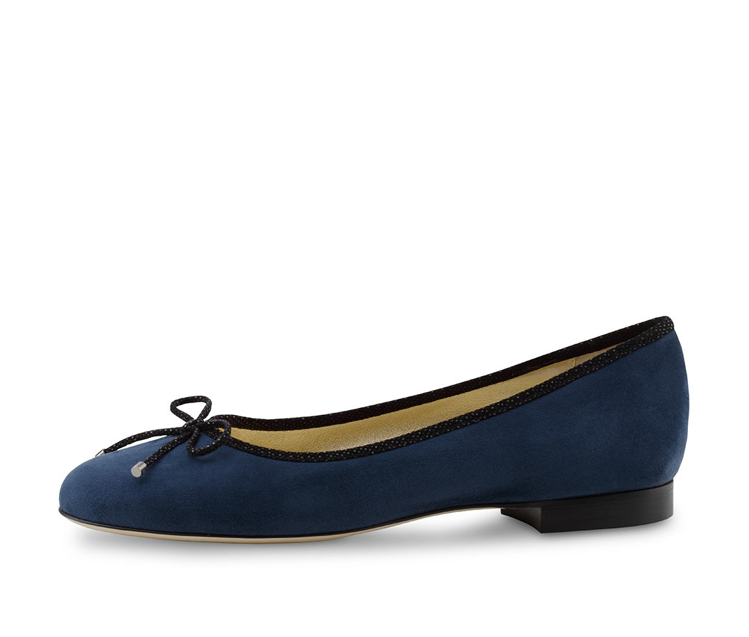 The combination of blue supple goat suede, black leather piping and discreet bow accentuates the minimalistic design of these ballerinas. Made in a small factory near Florence, this model is exceptionally comfortable thanks to the padded footbed and extremely flexible leather sole.