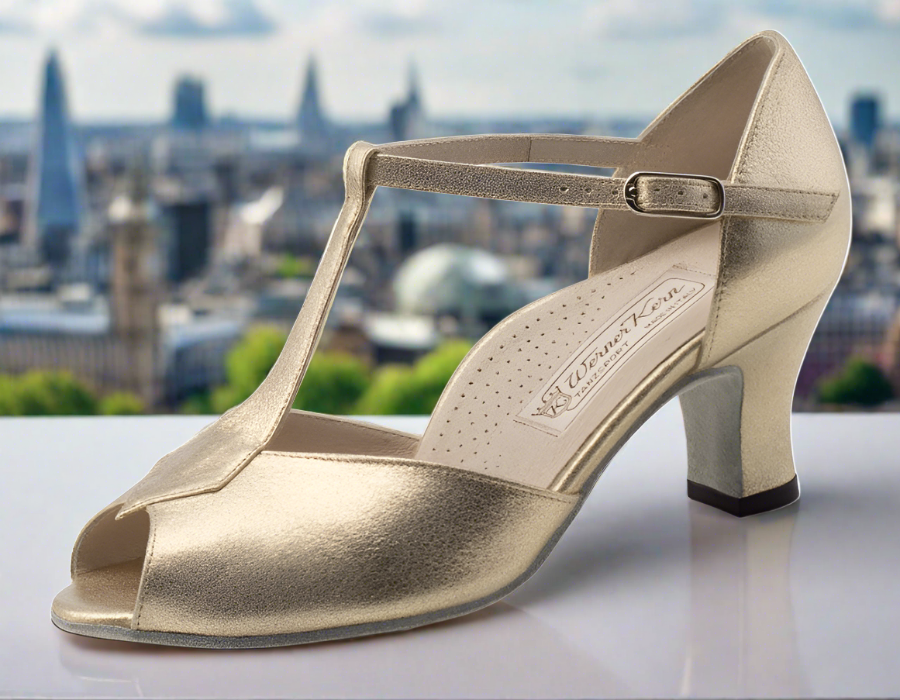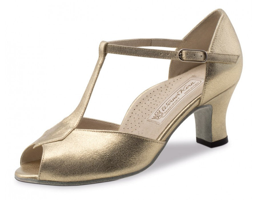 Entincingly comfortable Werner Kern dancing shoe with T-Strap and indicidually adjustable ankle strap combines optical elegance and perfect fit.