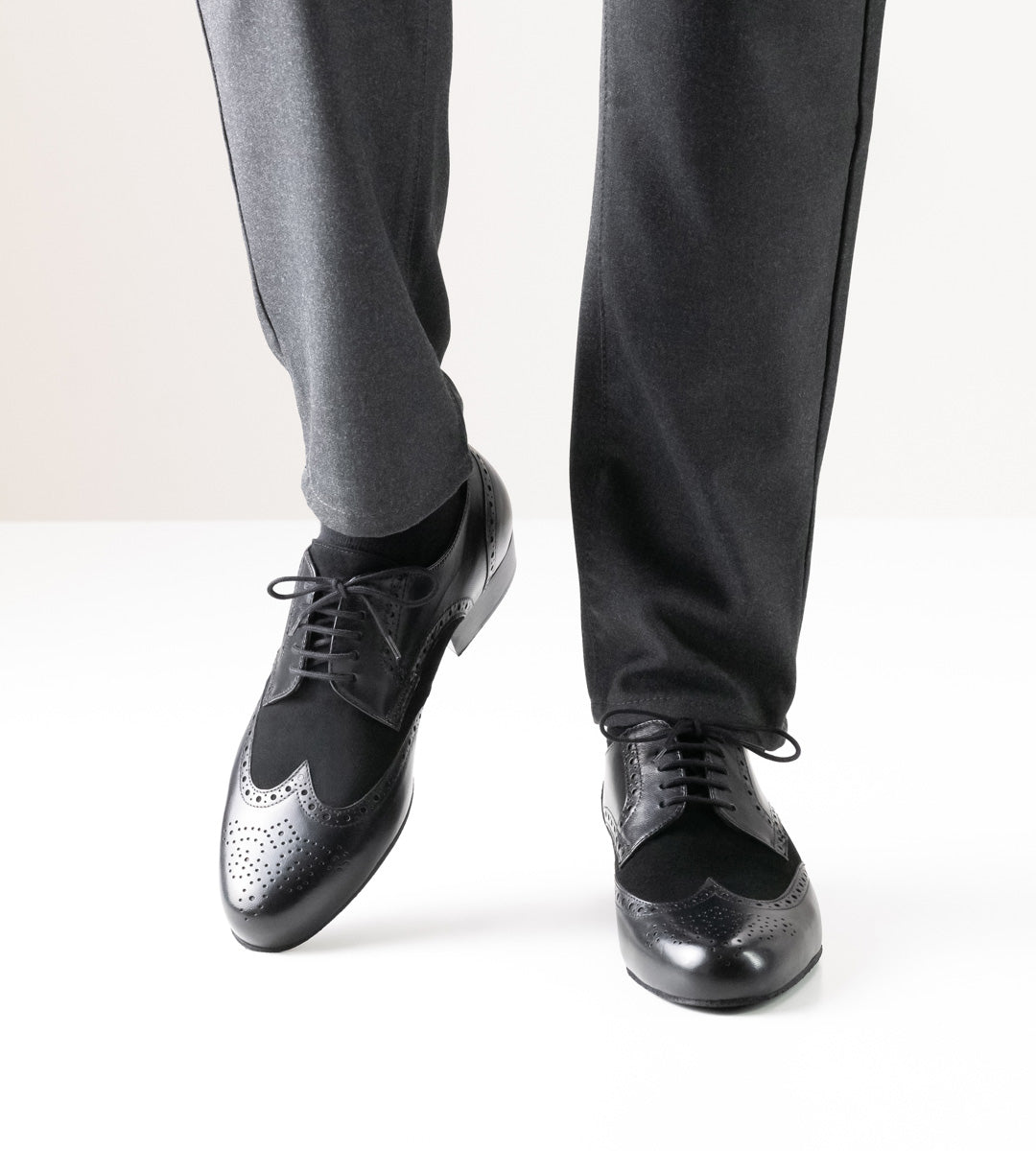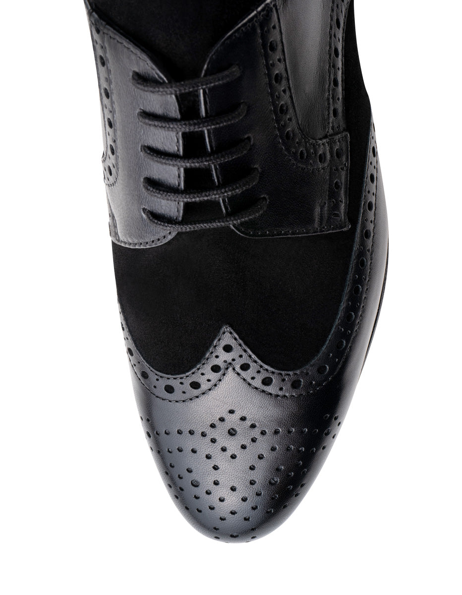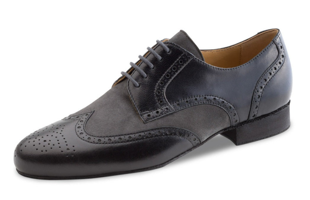 Classic-elegant Werner Kern men's dance shoe in a precious nappa/nubuk combination. The hand-braided wing cap gives this shoe its stylish appearance. The slightly elevated and bevelled heel in connection with the comfortable 5-hole lacing provide and optimal and secure fit. The shoe is lined with soft glove-quality calfskin.