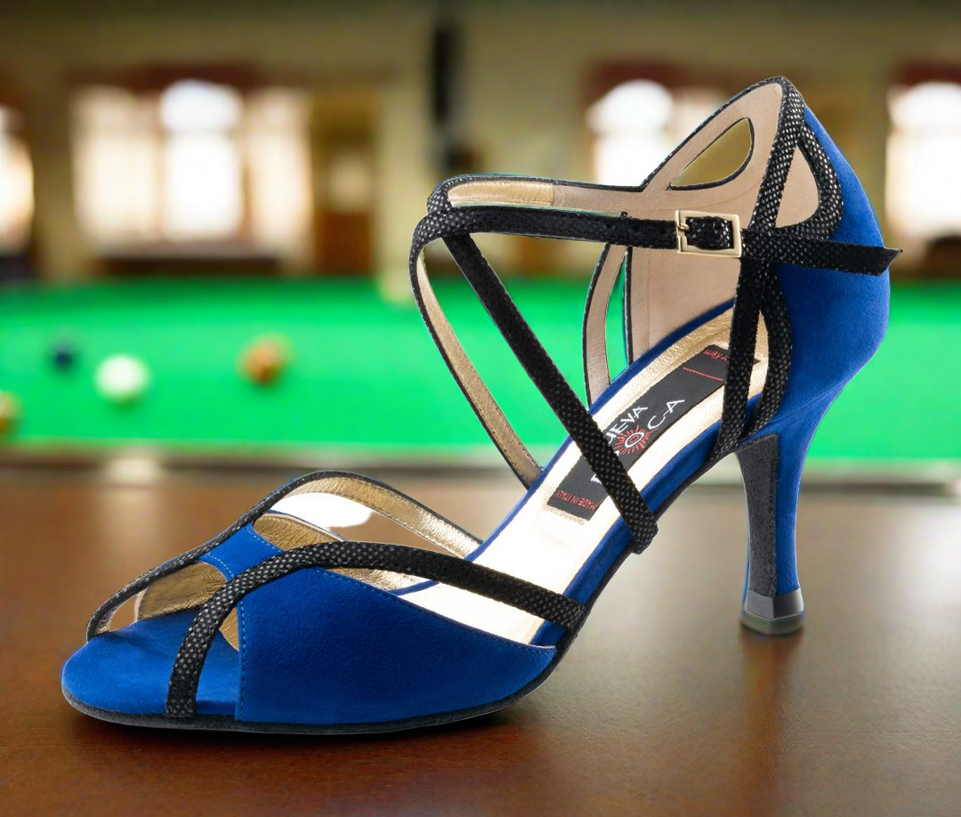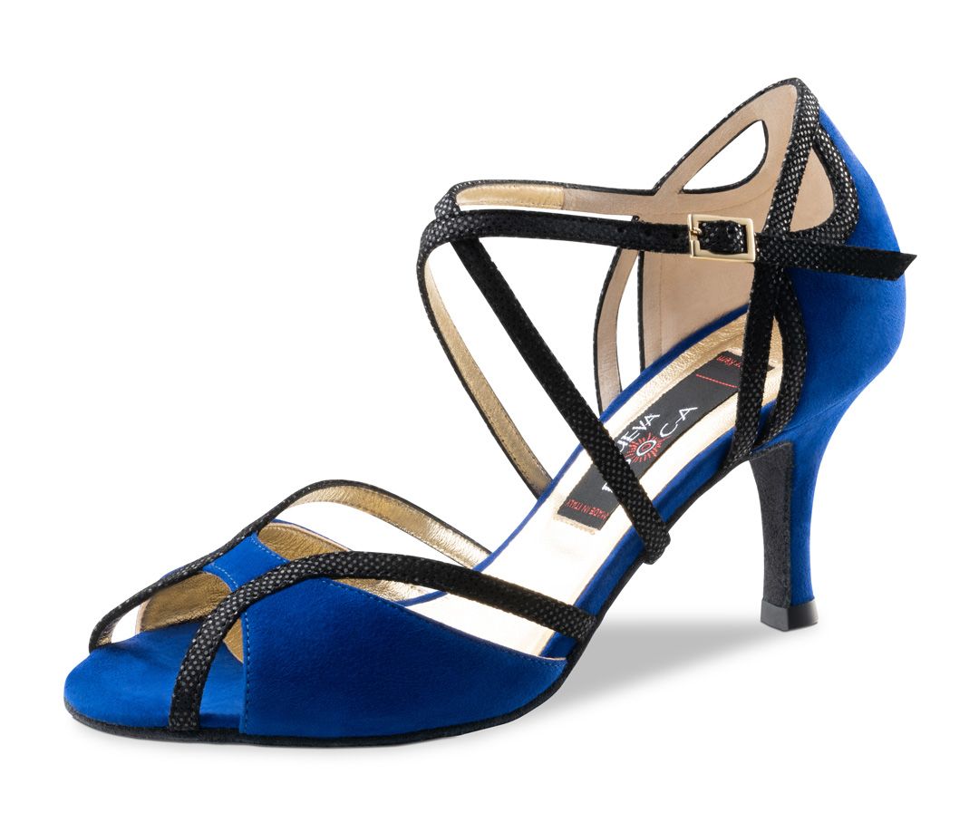 Spirited Nueva Epoca dance shoe by Werner Kern in fashionable indigi blue. The breaks in the heel and in the forefoot area make this shoe particularly light and lively. The cross straps, which can be individually adjusted both under the sole and on the heel, guarantee a perfect fit and exceptional fit.