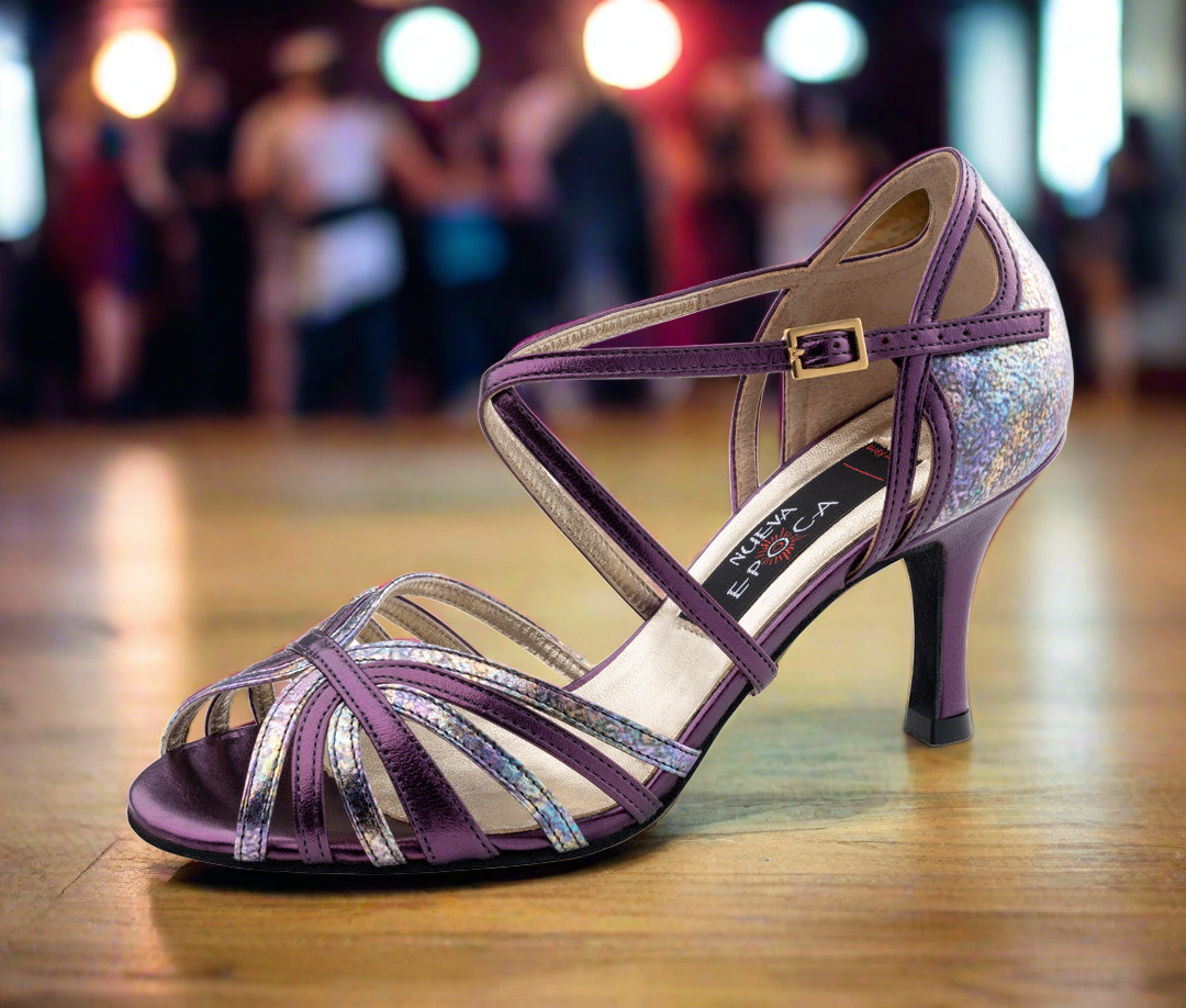 Sophisticated and fancifull at the same time, these Nueva Epoca Camelia dance shoes will take you on the dance floor. Both the filigree front, which gives your foot a secure hold, and the back-part with fine cut-outs contribute to the timeless look of these dance shoes. A fine cross ankle strap, which can be individually adjusted to your foot, both under the sole and at the heel, provides the secure hold.