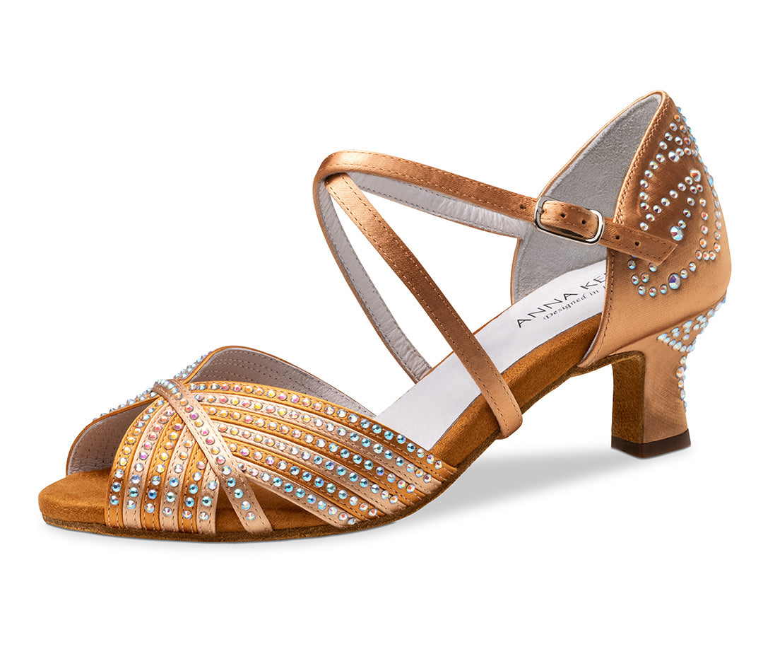 Discover the perfect companion for every dance floor. The Esmee ladies' dance shoe by Anna Kern in elegant nude satin combines glamorous design with maximum comfort. The elegant, crossed straps provide secure support, while sparkling rhinestones on the toe and heel visually complete the design. With a comfortable 5 cm flare heel, this dance shoe is ideal for Salsa, Bachata and Kizomba. The softly cushioned insole and breathable lining offer optimal comfort – even during long dance evenings. The adjustable strap ensures a perfect fit and individual adjustability.