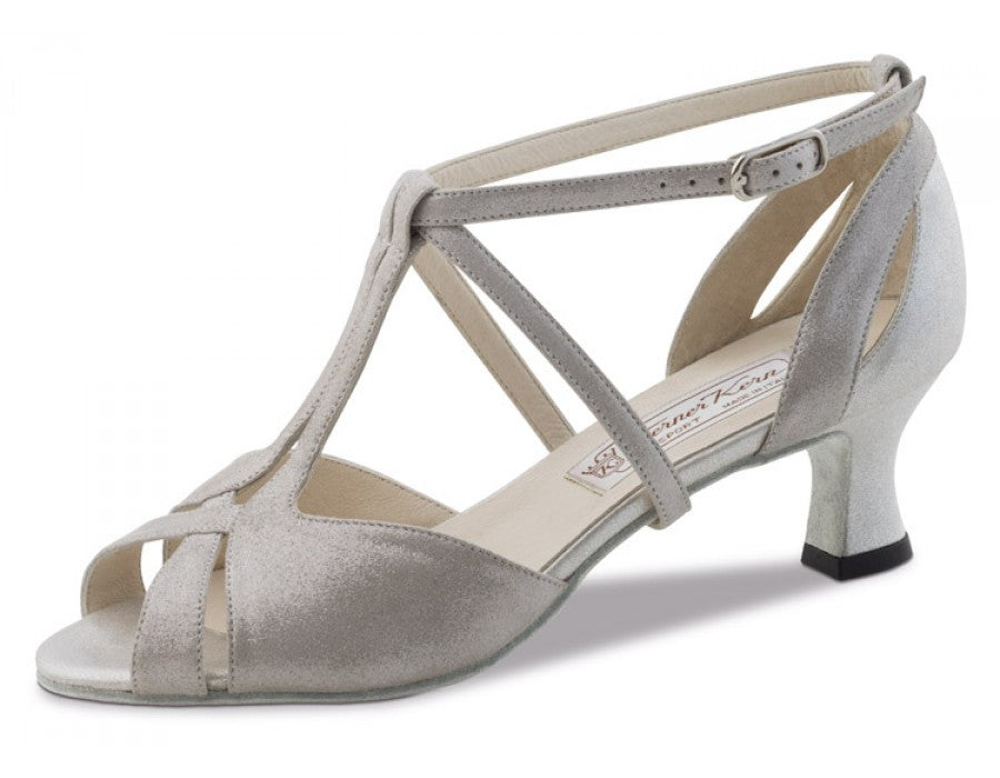 Unparalleled dancing shoe with T-strap and a filigree front part as well as a beautifully formed heel. The shoe has individually adjustable crossed instep and heel straps beneath the sole as well as at the heel in connection with the T-strap offers a perfect and extremely comfortable fit.
