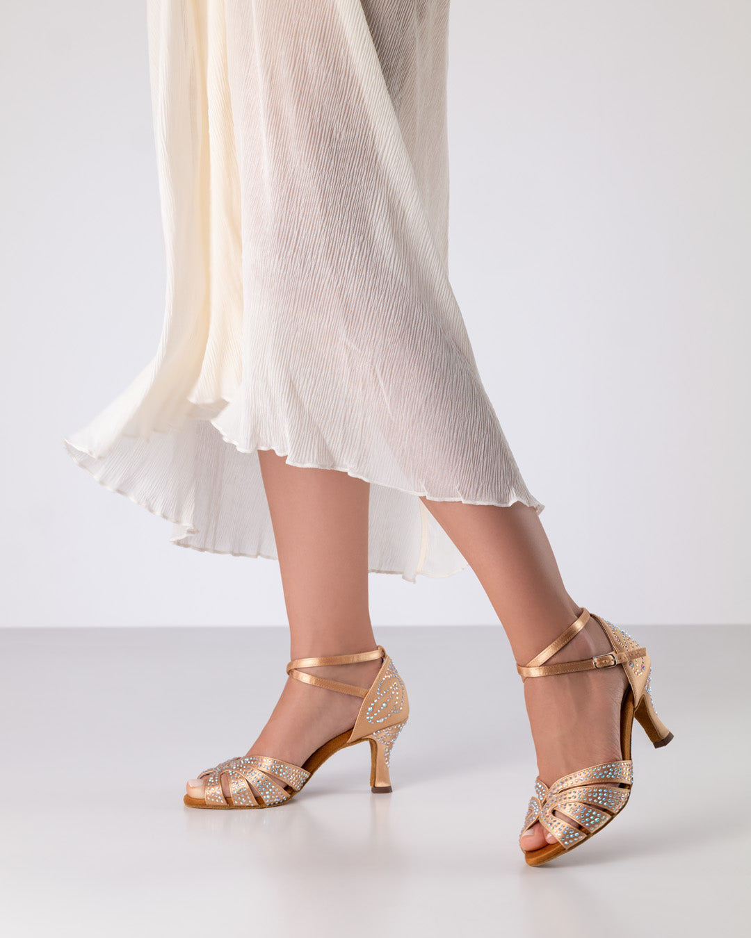 Delicate nude satin embellished with rhinestones, gently and smoothly conforming to the foot -