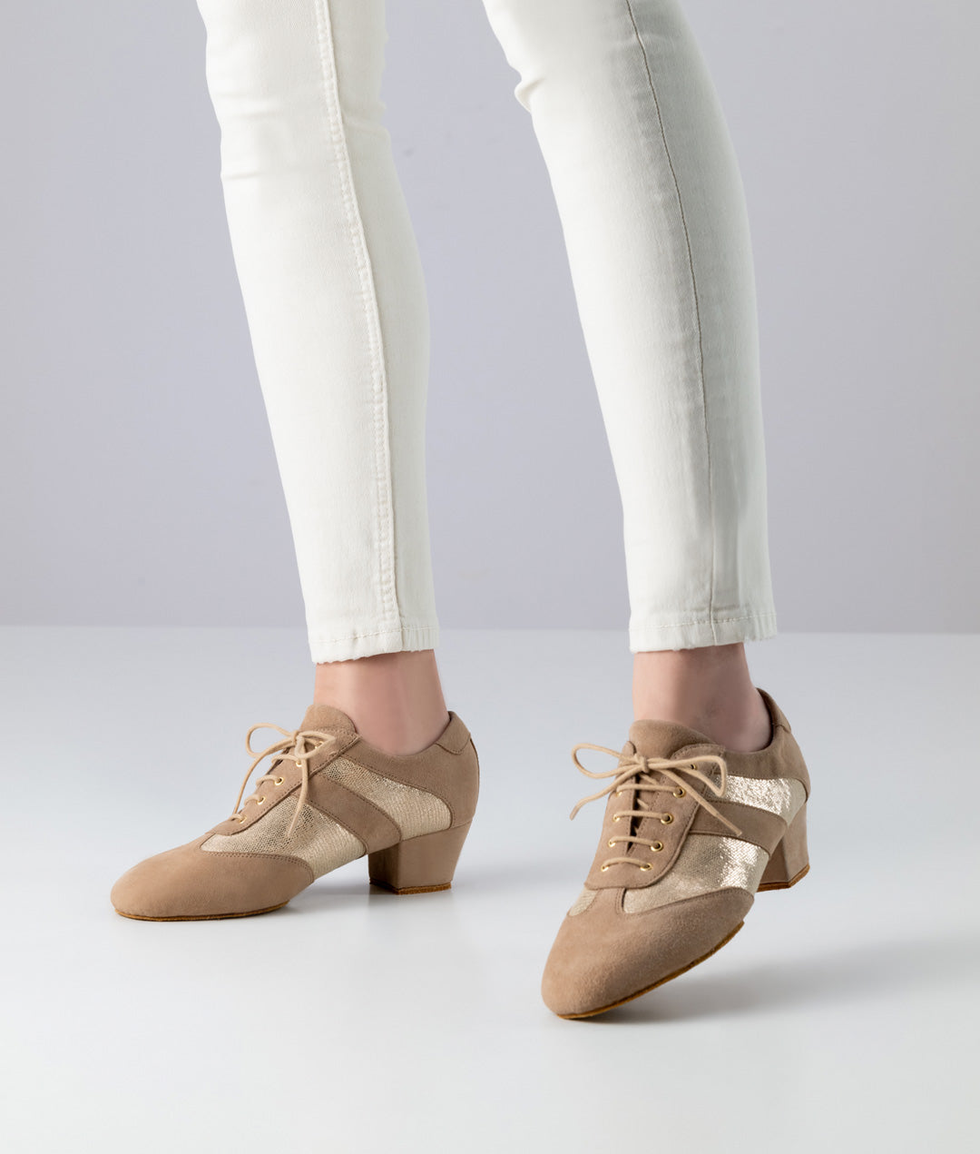 Step onto the dance floor in style and comfort with the trainer dance shoes Sandrine from Anna Kern. This elegant dance shoe combines beige suede with shimmering gold accents for a modern, sophisticated look. The split sole ensures maximum flexibility, while the 5-hole lacing provides a secure fit - ideal for demanding dance routines.